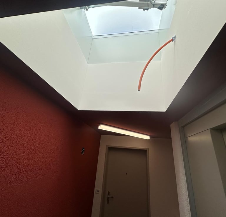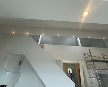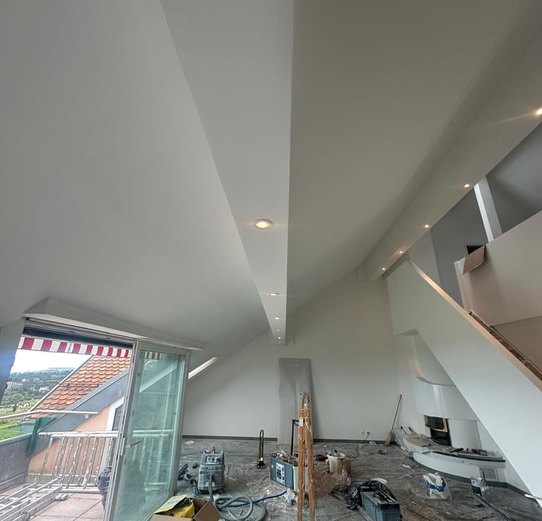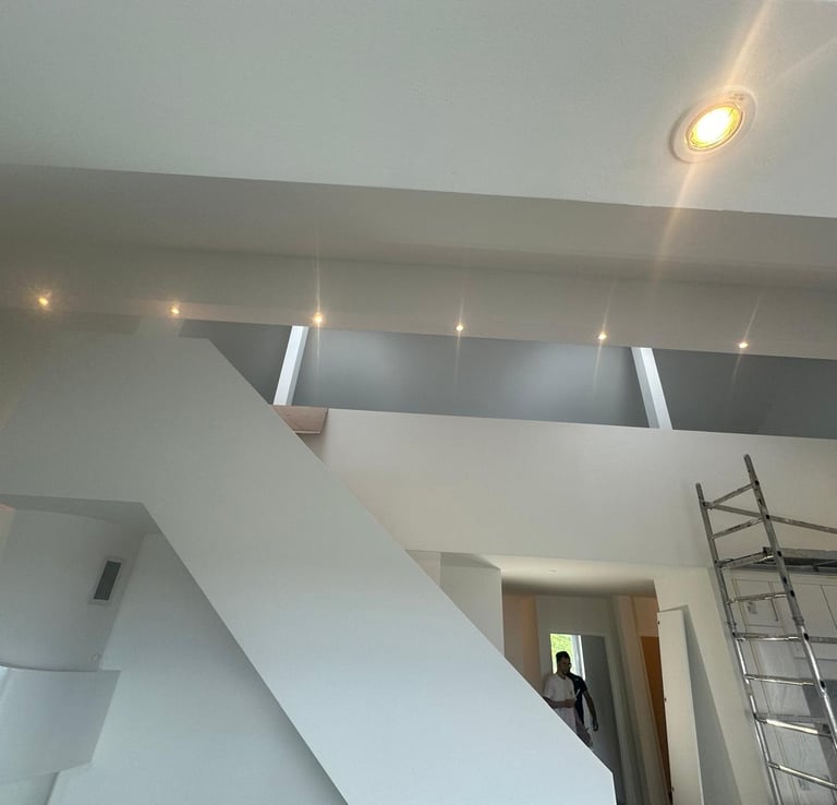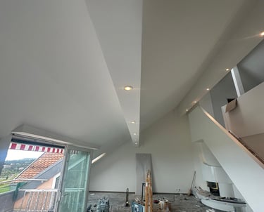 Réalisation d'un faux plafond en placo-plâtre avec intégration discrète de spots lumineux encastrés, assurant une finition lisse et moderne. Cette installation optimise l’éclairage naturel de la pièce et souligne élégamment les volumes.