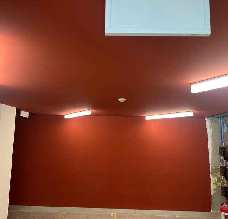 Création d'un faux plafond en placo-plâtre avec finition en peinture colorée, accompagné d'un crépi décoratif appliqué sur les murs pour une ambiance moderne et chaleureuse.