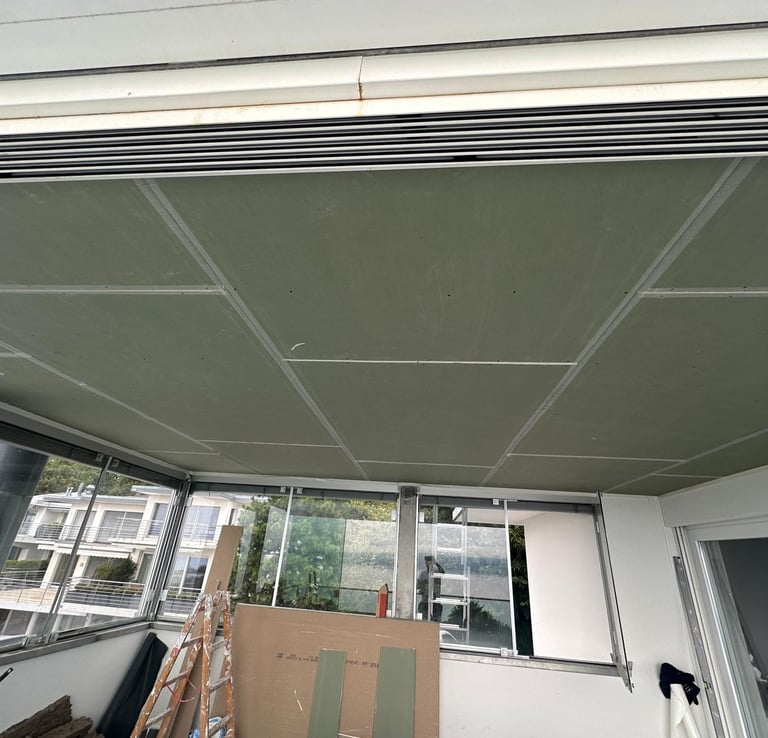 Réalisation d'un fond plafond dans une veranda privée.